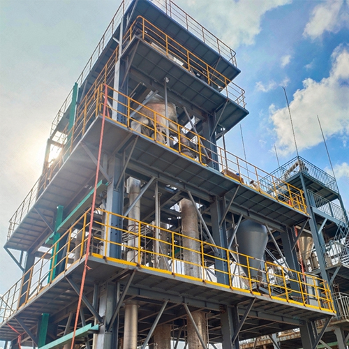 物料经过降膜蒸发器顶部膜头均匀分布后进入各膜管,物料在膜管内经蒸汽加热部分气化,气相物料经除雾器和连通管进入精馏塔,液相物料在蒸发器底部即为浓品。